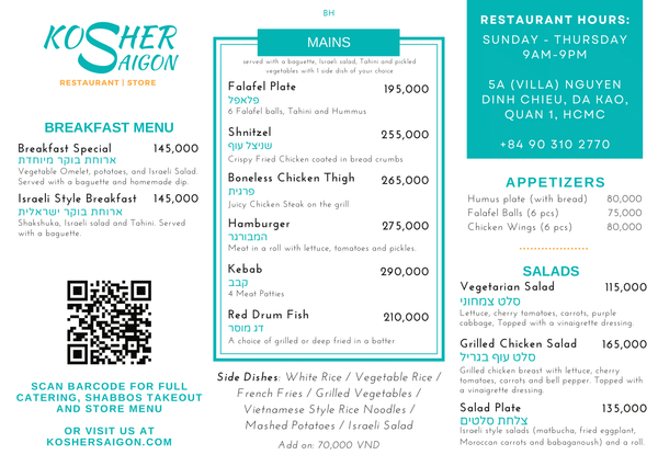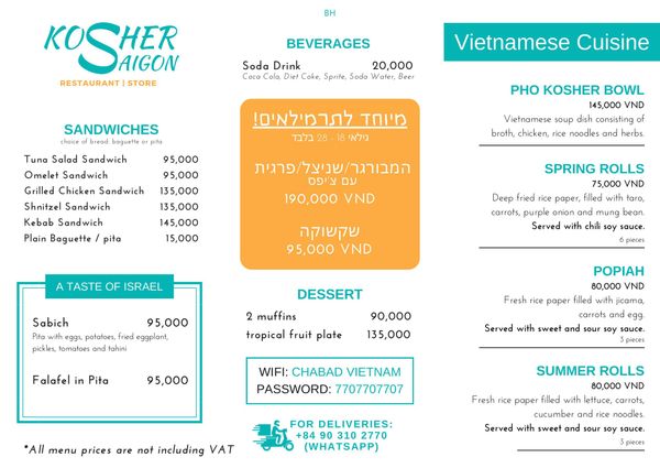 The kosher restaurant is located at the Chabad Center, where you can enjoy a hot, fresh meal—even in Vietnam!